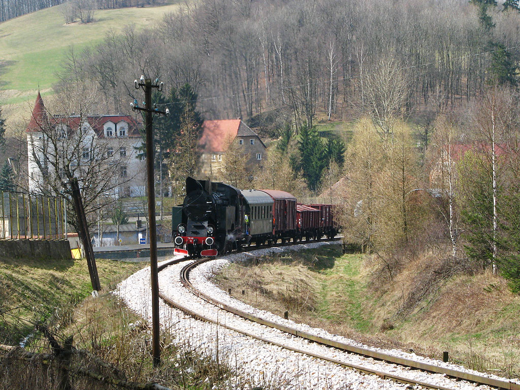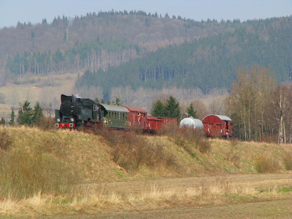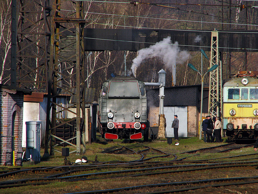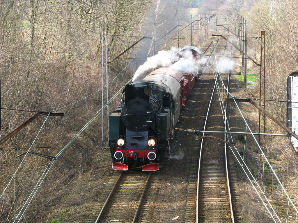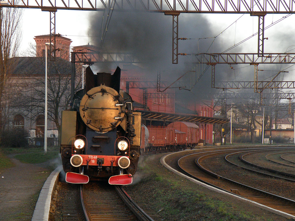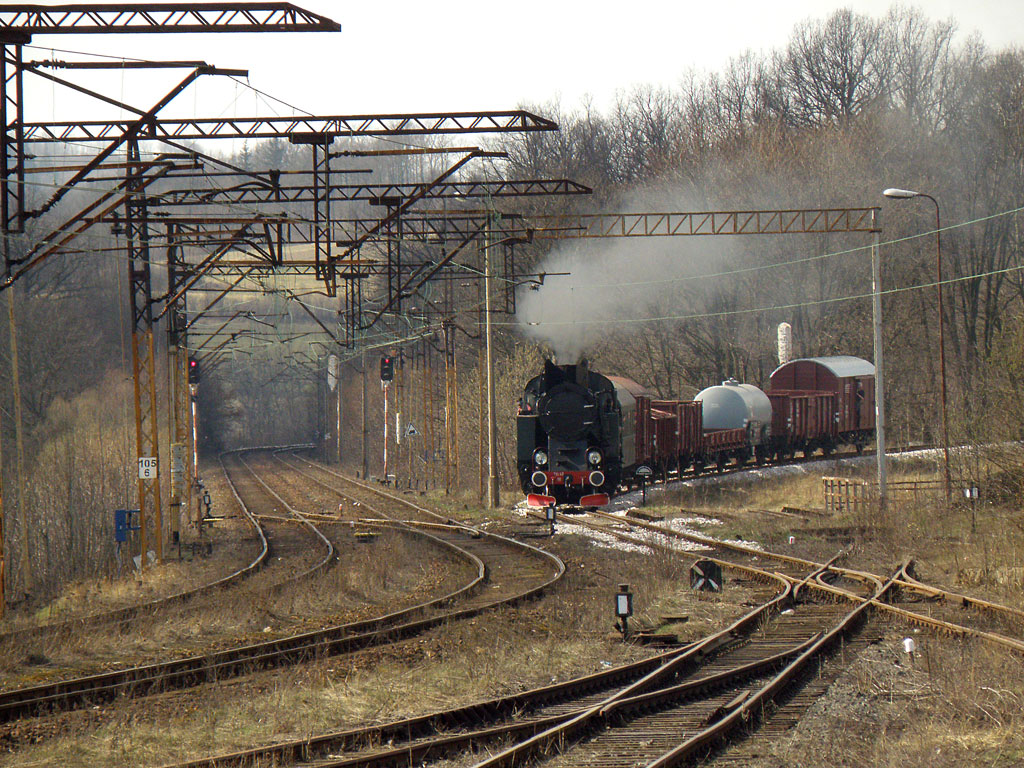 W dniu 4 kwietnia 2009 Klub Sympatyków Kolei we Wrocławiu zorganizował przejazd pociągu specjalnego w relacji Wrocław Głowny - Marciszów - Wojcieszów Górny - Wrocław. Pociąg prowadził parowóz TKt48-18, skład zestawiony był z jednego wagonu osobowego typu Ci28 oraz 7 wagonów towarowych, które w minionym okresie zostały wyremontowane przez członków KSK. U nas w klubie jakoś nikt nie przejawiał zbytniego entuzjazmu z tej okazji i być może impreza przeszłaby bez echa gdyby nie inicjatywa Piotrka. Zarzucony temat trafił na podatny grunt i od razu znaleźli się chętni. Zwłaszcza, że wyjazd zapowiadał się naprawdę wariacko, Piotrek po popołudniowej zmianie, ja po dwudniowym wypadzie służbowym a przed nami niemalże cała doba zmagania się z parowozem i odległością od domu. Ale cóż nikt nie mówił, że będzie lekko albo że my jesteśmy normalni. Tak więc o punktualnie o 01:10 Piter zabiera mnie i jedziemy po Nemo oraz Radka by 30 minut później ruszyć przez nocną mgłę w kierunku Wrocławia. Aby zdążyć na wjazd parowozu na dworzec Główny Piotrek musiał ostro deptać i niestety będzie to pewnie drogo kosztowało bo tuż za Długołęką błysk flesza z masztu radaru podniósł ostro ciśnienie i popsuł radosną atmosferę wyjazdu. Na szczęście dalej obyło się bez podobnych nieszczęść. Udało się dotrzeć do Wrocławia na długo przed przyjazdem pociągu i snując się po stacji zdążyliśmy porządnie zmarznąć. Wreszcie sapiąc i gwiżdżąc sympatyczny uszatek wtoczył się w perony i liczne zebranych „mikoli” ogarnął szał focenia. My oczywiście na luzie podchodząc do tematu staraliśmy się wybrać miejsca z innej strony niż większość ale i tak panujące ciemności, światło sodowe oraz masa kolorowej, biegającej bez sensu sierści nie dawały szans na przyzwoite zdjęcia.