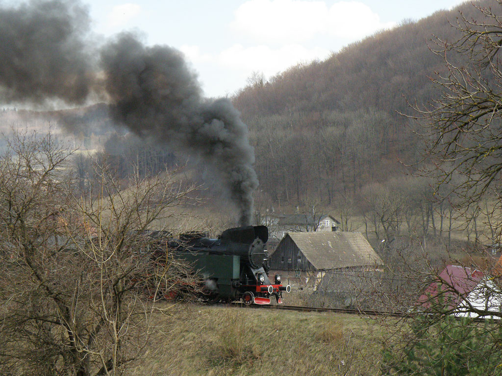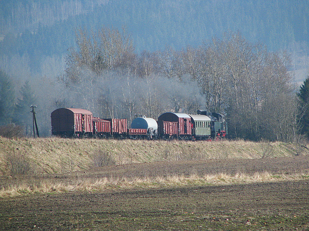 Kilka fotek w stacji i udajemy się na pobliską łączkę na pierwszy z planowanych fotostopów. Słoneczko pięknie przygrzało i rozkoszujemy się urokami wczesnej wiosny. Niestety tu wyszła spora wtopa organizatorów. Po pierwsze brak dyscypliny nad uczestnikami przejazdu, rozłazili się jak stonka po kartoflisku co opóźniało każdy fotostop. Po drugie słabo zorganizowany obrząd parowozu. Najpierw manewry na stacji potem wodowanie, oczywiście w połowie brakło wody i zanim strażacy z OSP dowieźli resztę parowóz stał bezczynnie. Wreszcie po niemal półtoragodzinnym oczekiwaniu maszyna ruszyła a my wraz z nią.