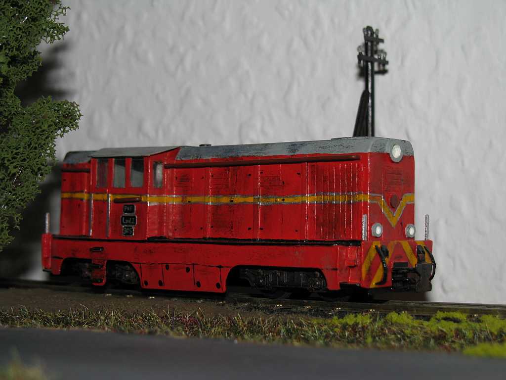 To ta lokomotywa po prawej stronie na zdjęciu, z żółtymi pasami na czołownicy. Nie ma niestety silnika. Podwozie wykonałem jako stałe z kółkami po starej TT-ce. Lokomotywa po lewej stronie jest trochę bardziej zaawansowana technicznie. Przede wszystkim porusza się o własnych siłach. Podwozie silnikowe pochodzi z lokomotywki wąskotorowej ROCO, dobrze znanej modelarzom wąskich torów. Pudło i kabinę maszynisty wykonałem z impregnowanej klejem tektury. Pomosty po obu stronach przedziału silnikowego są zrobione z karty telefonicznej. Z plastiku karcianego wykonane są również wiązary i zewnętrzne elementy układu napędowego. Model jeździ, ale wiązary niestety nie obracają się. Taka jest cena zbyt ubogiego warsztatu mechanicznego. W kolekcji posiadam jeszcze trzecia taką lokomotywkę. O jej budowie zaważyło malowanie. Oto ona: