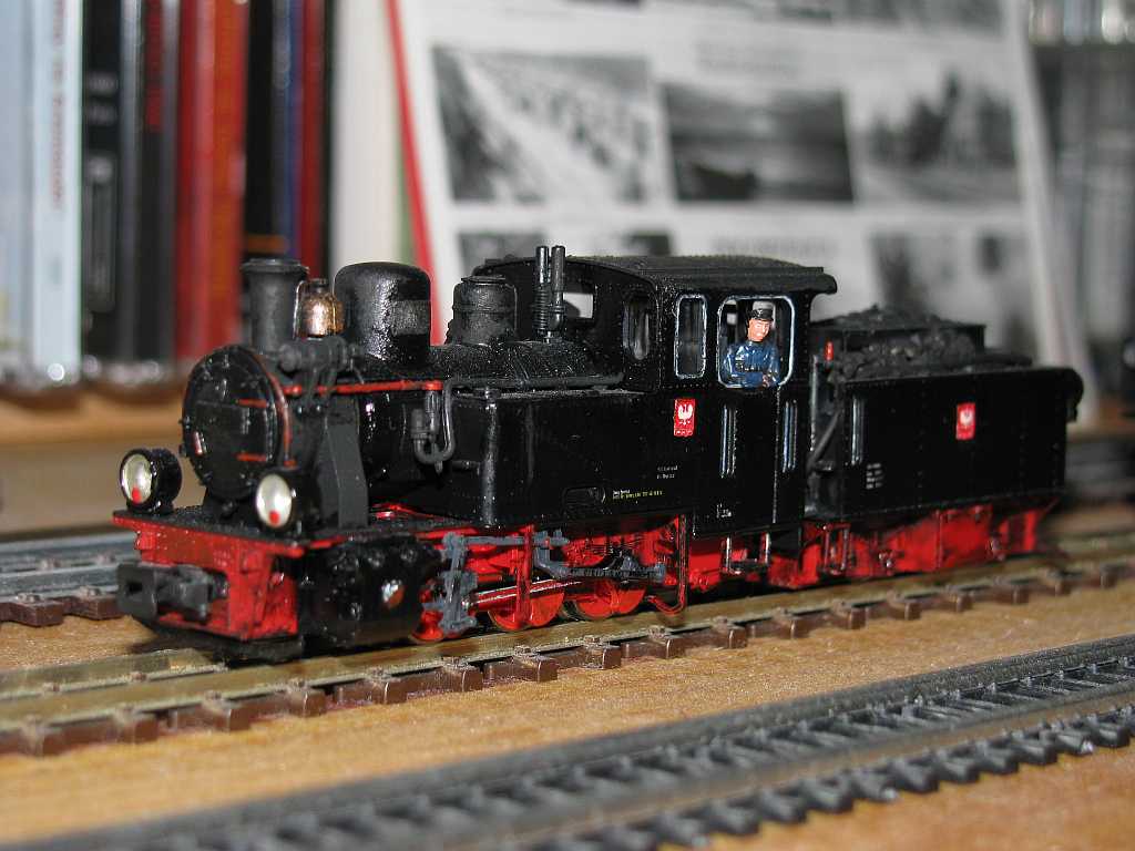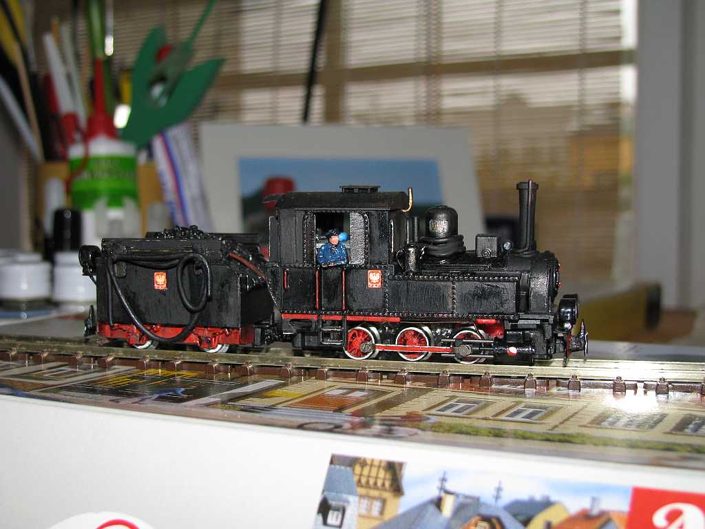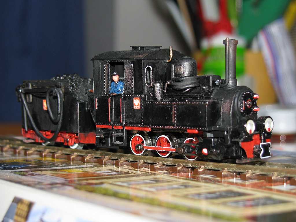 Kolejnym parowozem z serii ROCO jest ten egzemplarz. Miałem już wtedy w miarę przyzwoicie opracowana technikę stylizacji. Wykorzystałem stare części od wagonów w skali H0. Zderzaki wykonałem z elementów zderzaków trzonowych typu pruskiego, węże do nabierania do nabierania wody za pomocą pulsometru-z kawałka drucika z izolacja, gwizdawkę również z drucika, a odprowadzenie pary z prądnicy-ze zwykłego spinacza biurowego. Pozostało jeszcze przedłużyć budkę maszynisty aby nadać lokomotywce lepsze proporcje, dokleić bańkę z oliwą, orzełki na budkę, odgarniacze pod czołownicą i model był gotowy. Taki model można stylizować w nieskończoność aż do granicy, za której przekroczeniem opłaca się już w miarę umiejętności i posiadanego warsztatu budować modele od podstaw. Parowozik połączony jest z tendrem typu "Kruszwica".