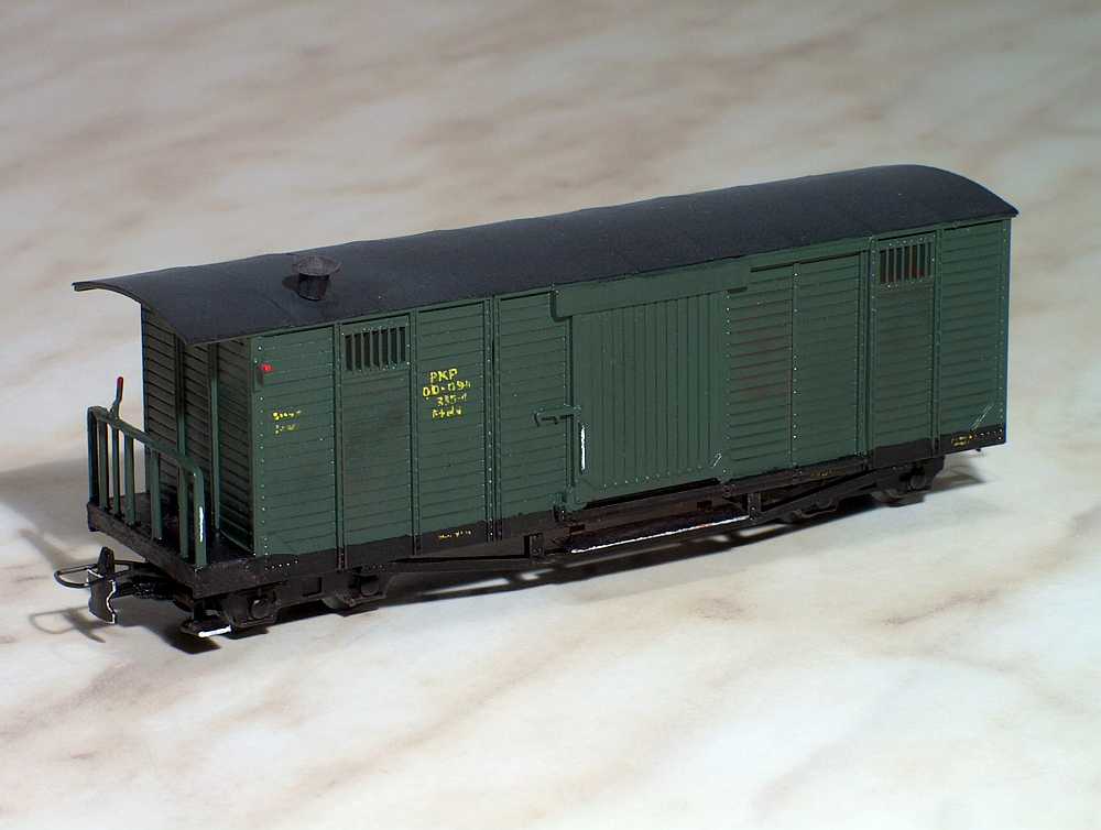 Do wykonania wąskotorowych wagonów krytych wykorzystałem pudła wagonów krytych, dwuosiowych budowy pruskiej w skali H0. Można zaobserwować je na zdjęciu z lokomotywą Lyd2. Do budowy brankardu wykorzystałem wagon kryty w skali H0e firmy Liliput. Skróciłem go o dwie sekcje na długości i pomalowałem na zielono. Jako podwozie użyłem wózków od starych węglarek PIKO w skali N. Oto ten wagonik: