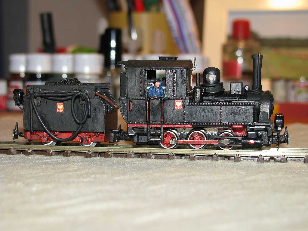 Dodałem mu kilka elementów wzbogacających: bańkę z oliwą, gwizdawkę i wąż z kabelka, zawory bezpieczeństwa, reflektory odlewane z mosiądzu oraz komin od parowozika firmy ROCO. Na przystanku osobowym Annopole prezentuje się z tenderkiem doczepnym typu Kruszwica: