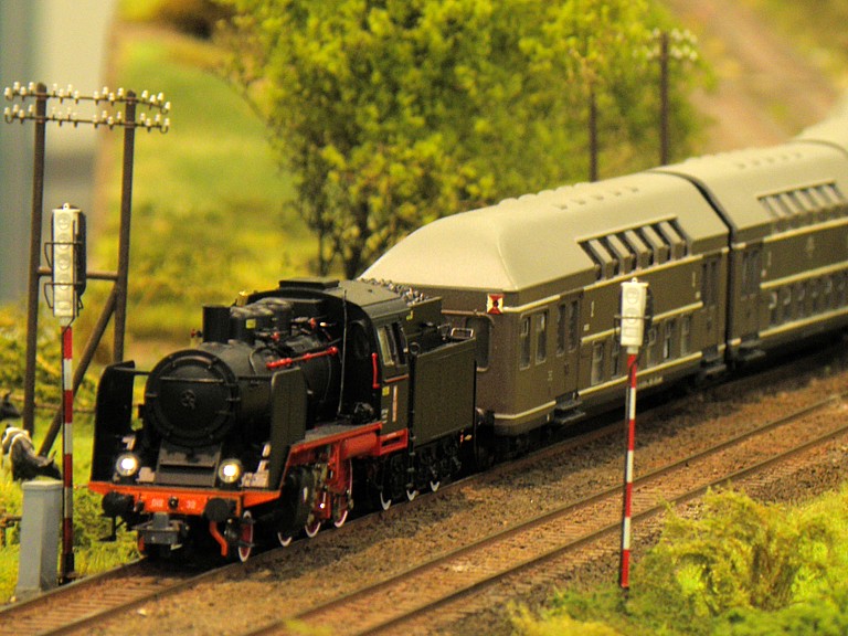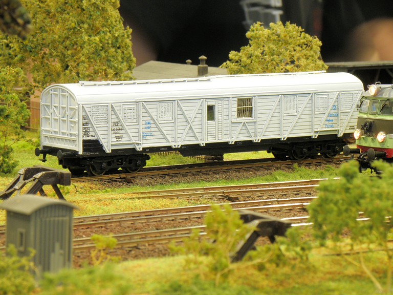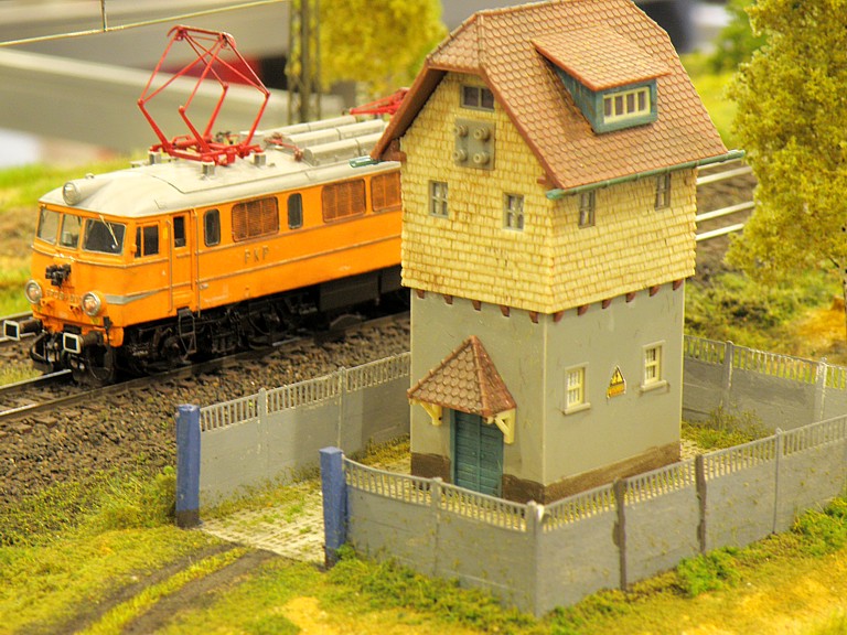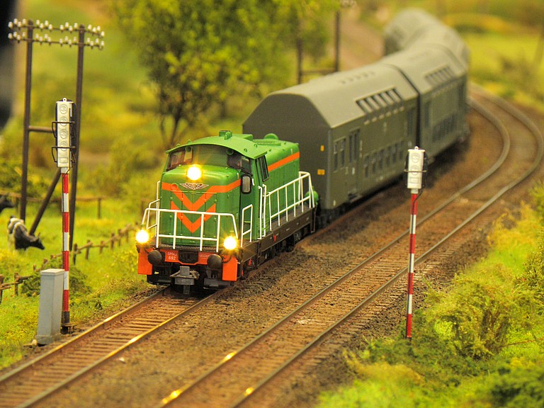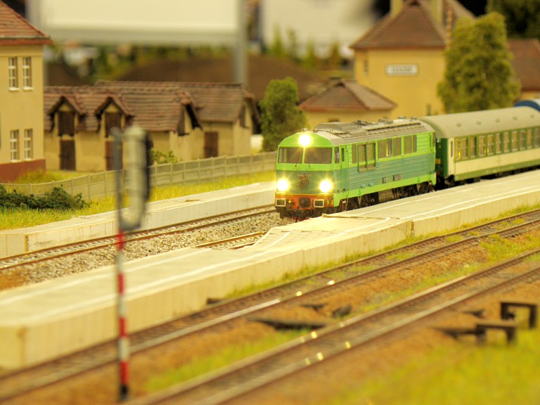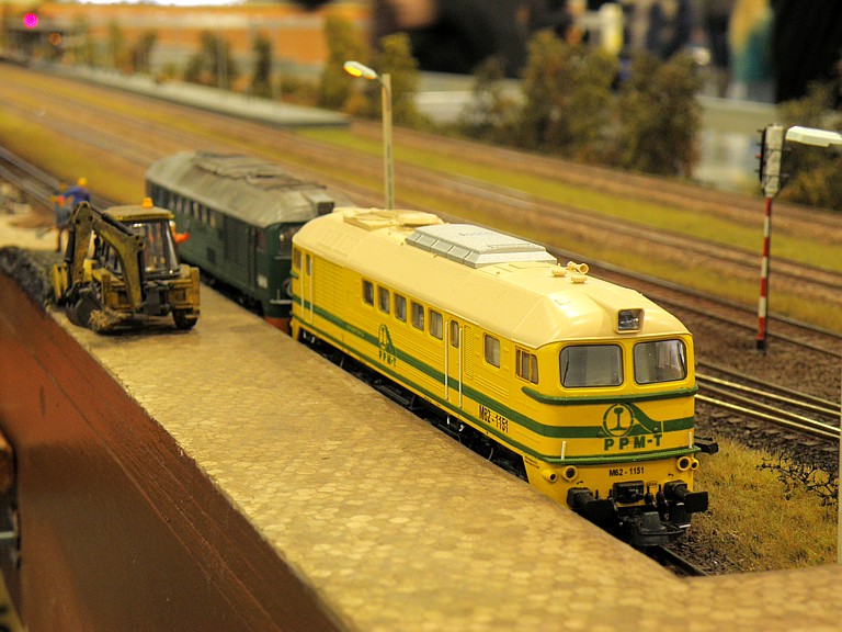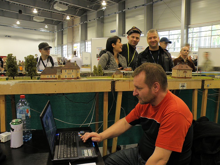 Jak zwykle na Salon Hobby każdy mógł znaleźć coś dla siebie. Swoje stoiska mieli wielbiciele samolotów, statków, samochodów, militarki, figurek oraz fantastyki. Sporą część jednej z hal zajęli też entuzjaści gier. Nas oczywiście najbardziej interesowała kolejowa część ekspozycji i na niej się skupimy. Punktem centralnym i najbardziej przykuwającym uwagę była oczywiście olbrzymia makieta kolejowa w skali H0. Powstała wspólnym wysiłkiem niemałej liczby osób działających w stowarzyszeniach oraz indywidualnie. Nie będę się rozwodził nad ideą wspólnej makiety modułowej, każdy wie o co chodzi, zatrzymam się tylko nad zagadnieniem sterowania tak dużym obiektem, zwłaszcza, że obecny standard wcale nie był z początku taki oczywisty. Na pierwszych zjazdach sterowanie było jeszcze tradycyjne, analogowe, z czasem zastąpiło je cyfrowe wg standardu NMRA DCC. Po początkowych eksperymentach z magistralą XpressNet ostatecznie obowiązującym standardem okazała się magistrala z protokołem LocoNet. Pokrótce polega to na tym, że do każdej lokomotywy (wyposażonej oczywiście w dekoder) przypisany jest jeden sterownik (tzw. FRED), który ma zaprogramowany ten sam adres, co dekoder w lokomotywie. Wyeliminowało to możliwość przypadkowego zasterowania niewłaściwą lokomotywą poprzez wpisanie błędnego adresu (co zdarzało się w standardzie XpressNet). Wzdłuż makiety, co kilka metrów (szczególnie w newralgicznych miejscach takich jak semafory) umieszczane są gniazda. Maszynista prowadzący pociąg podąża wzdłuż toru (mijając kolejne miejscowości - jak w oryginale) i w razie potrzeby wpina się w magistralę celem zasterowania lokomotywą (np. żeby zatrzymać ją za semaforem). Tak duża liczba oddzielonych od siebie stacji wymaga oczywiście odpowiedniej łączności. W tym celu wzdłuż makiety rozpięta została linia telefoniczna, umożliwiająca (jak w oryginale) telefoniczne zapowiadanie pociągów. Podobnie jak na prawdziwej kolei, uczestników obowiązywał rozkład jazdy. W tym miejscu należy wyrazić uznanie dla głównego koordynatora makiety, kol. Maćka Czapkiewicza z Krakowa, który wykonał gigantyczną, niestety przez mało kogo docenioną, pracę układając rozkład jazdy (z resztą mocno napięty!) dla tak dużego obiektu. Po początkowych przejściowych trudnościach (niemożliwych do uniknięcia przy tak dużej liczbie uczestników) wszystko ostatecznie zadziałało, a liczne pociągi nadplanowe jeszcze urozmaiciły ruch.