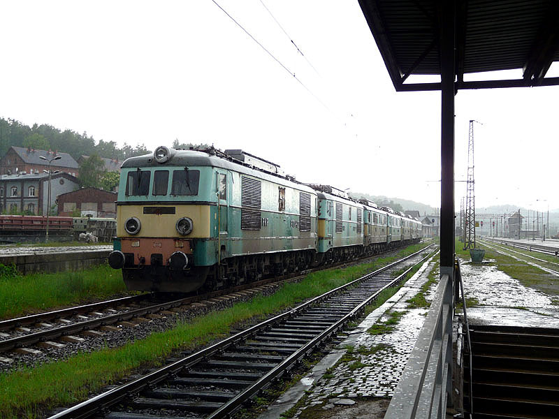 Przejazd „Sputnikiem„ do Jeleniej Góry z Wrocławia, niesamowita gratka dla MK i innych normalniejszych, dostałem zaproszenie od Piotrka, trochę mnie to zdziwiło, ponieważ ostatnimi czasy jakoś pomijany byłem w doborze składów wycieczkowych. Czy to za sprawą niewyparzonej gęby, czy też wszechobecnego krytykanctwa, a może sam nie wiem czemu, dość że dostąpiłem zaszczytu podróżowania z samym Prezesem i Skarbnikiem jego samochodem. Wyruszyliśmy w Niedzielę świtem mglistym, już pora deszczowa w Polsce zadomowiła się na dobre, lecz poranek ten w miarę pogodnym miał pozostać. Droga jak droga, nie za szybko nie za wolno, już wiemy że mamy niedoczas, postanawiamy łapac skład po drodze. Trochę od tyłu dojeżdżamy do zapory na zalewie. Kilka zdjęc , dalej ku przygodzie, zaciągac się zaczyna i już w Wałbrzychu spotyka nas mały potop, oczywiście Piotrek musi na stronę, sekunda i dalej, a tu siurpryza, zgubił telefon, wracamy, jest leży kałuży i brzęczy, emocji huk, Radek gna w potokach wody, Piotrek rozbiera telefon. W miejscu w którym już kilka razy na imprezach zatrzymywaliśmy się, cykamy „kibelek” i zajmujemy stanowisko, czekając na jak mamy nadzieję spóźnionego „Sputnika”. Czekamy pół, drugie pół, i trzecie, mowa oczywiście o częściach godziny, niestety GŻ w śladowych ilościach na dnie, na dwóch mikroskopijna dawka. Coś jedzie, wow, jest, ale ET41-048, zwiastun dobrego początku czy raczej koniec, jedziemy na stację, Piotrek idzie do zawiadowcy, wraca już w strugach deszczu, raczej z nietęgą miną, oznajmia nam że pomylił daty i sputnik jechał w Sobotę, czyli mogliśmy Se na niego czekac, ze względu na ogólnodostępnośc naszych eposów, nie zacytuję słów które padły w ciągu kilku minut zagłuszając deszcz skutecznie. Ale jak relaks to relaks, pędzimy do Wałbrzycha, oglądamy sobie „sputników „kilka , kilka zdjęc w przerwach między kapielą, Nowa Ruda, chwilka, znów dalej, kopalnia kruszcu, cicho nikt nie pilnuje, rozłazimy się jak pchły, robiąc zdjęcia. Kłodzko zostawiamy samochód dośc daleko, maszerując z buta, spotykamy 311D- 04 oraz T448P-099 stojące pod murem oporowym, dwie szutrówki z Dolkomu, sporo oczekujących, żadnego pociągu, dobrze że choc się wypogodziło. Późno już czas wracac, poniedziałek już na nas czeka z nową porcją obowiązków i niespodzianek w służbie RP. Wycieczka daleka, mimo wszystko udana.