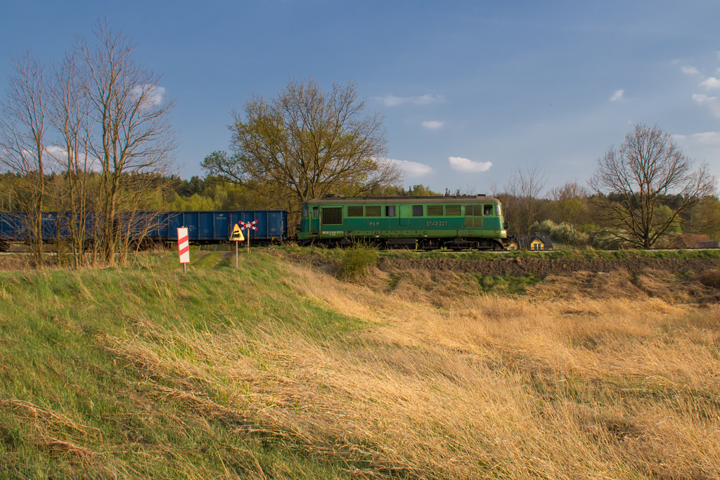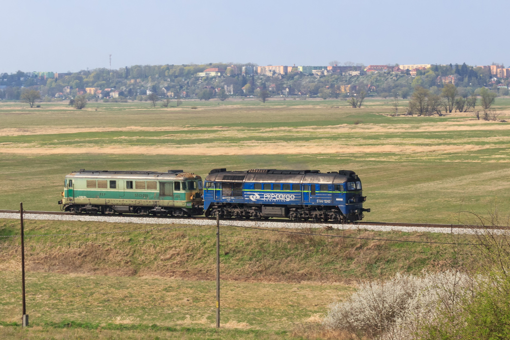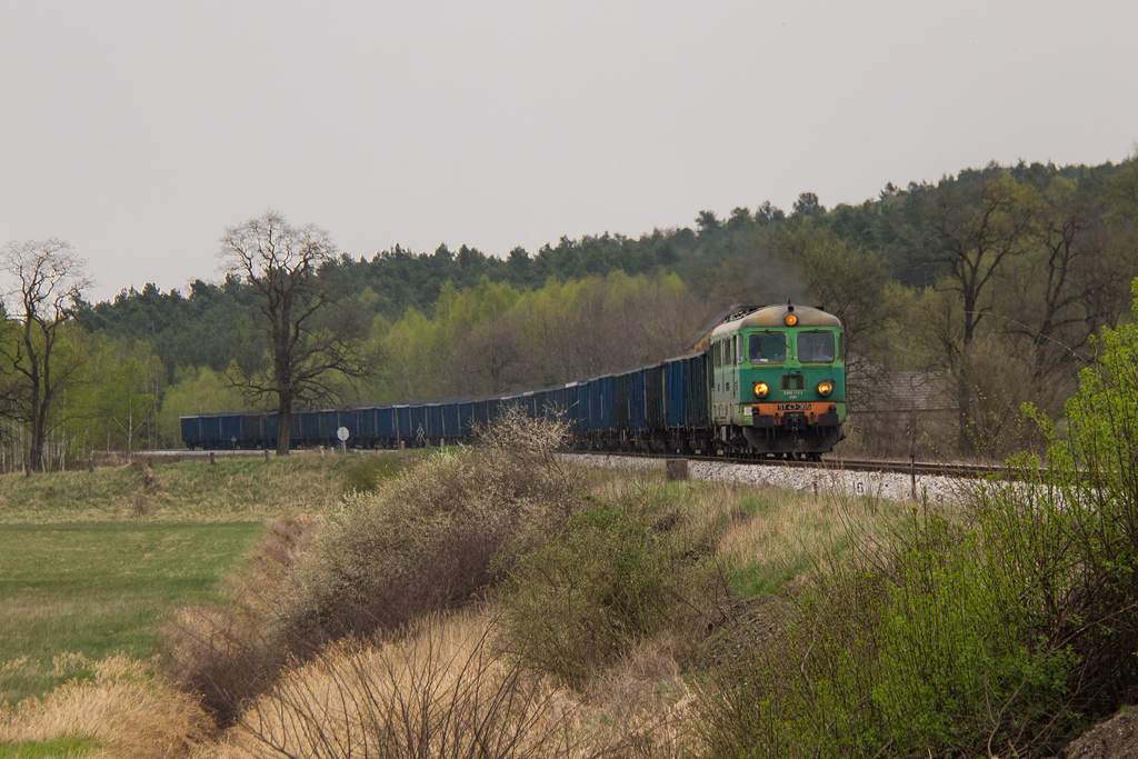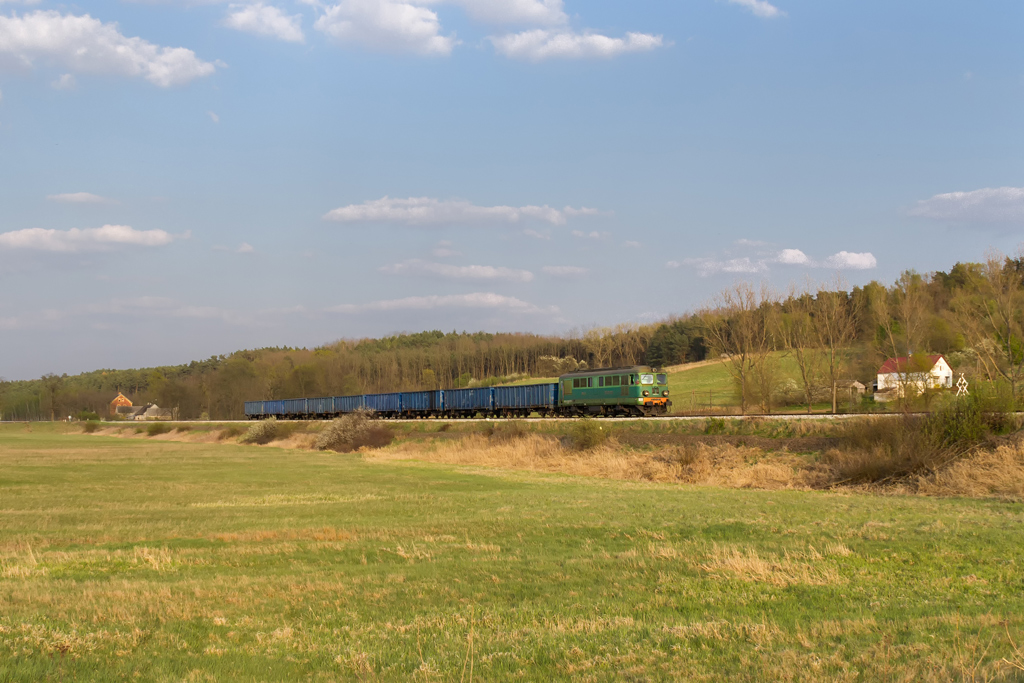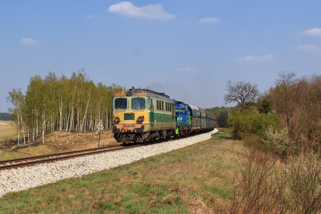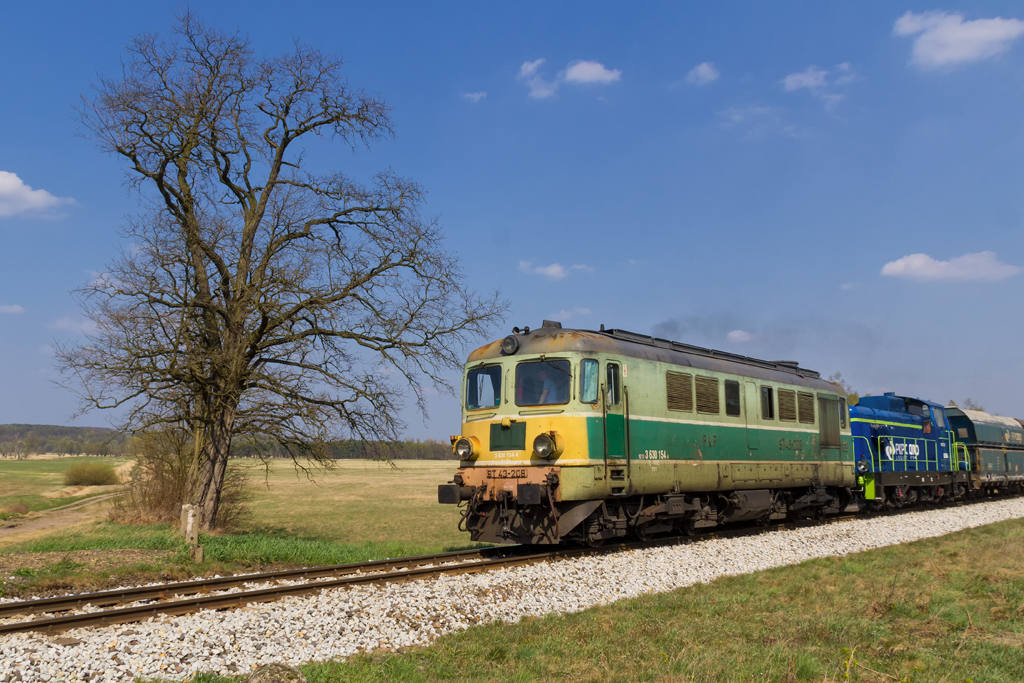 Przed południem wypakowuję się w Połupinie bo plan zakładał powtórzenie klatki z panoramą Krosna, tym razem w słońcu. Zaliczam sklepik i na wszelki wypadek odpalam radio. Niemal natychmiast słyszę meldujący się pod tarczą skład. Fuck! Nieparzysty a więc jedzie z Czerwieńska, ja mam do linii jakieś 700m i dzielą mnie od niej wiejskie zabudowania a do tego cały sprzęt w pozycji marszowej. Gnam mimo to by choć zobaczyć co mnie ominęło. Między drzewami turla się rumun w kolorze nadziei ze składem Simmsów, miód na me oczy. Czyli jeżdżą jeszcze! Skoro pojechał do Niemiec, to będzie przecież wracał, bajka! Maszeruję więc raźno 3km na górkę za Połupinem i wkrótce rozkładam małe obozowisko. 2h później radyjko się odzywa i mechanik zgłasza defektującego ST43 jadącego od Czerwieńśka i martwi się czy uda mu się dociągnąć nawet do Krosna. Pędzę więc na złamanie karku w dół by złapać go na łuku i parę chwil później słychać znajome pyr-pyr. Piękna maszyna, jeszcze z żółtym czołem (żywe są chyba tylko 4 ) wraz z ze stonką trudzą się ze składem. Okazuje się, że w Krośnie czeka już para luzaków na zwolnienie szlaku. Dyżurna z dyspozytorem ustalają, że do Niemiec ze składem pojedzie ST43-365 który zdążył już wrócić a padnięta 208-ka na haku kołomny wróci do Czerwieńska. Ehhh czemuż mnie nie ma teraz na stacji w Krośnie, dwa shulzery i kołomna manewrujące po stacji, jakiż to widok, jak to musi dudnić. Wracam na górkę i czekam na przejazd luzaków co ma miejsce niedługo później. Planowana klatka zrobiona, słońce nawet nie zaszło w krytycznym momencie ale nadal pozostaje niedosyt bo tym razem brakło składu. No nic przynajmniej jest motywacja do kolejnej wycieczki w to miejsce.