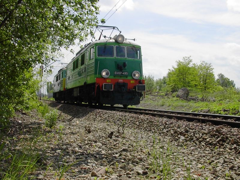 Na dworcu udajemy się wzdłuż torowiska i zajmujemy stanowisko, z dala od tłumów, pojawiają się dwie EU07 jedna zielona druga pięknie zażółcona, przystają na chwilę po d światłami, po czym odjeżdżają zwalniając miejsce drogiemu gościowi.