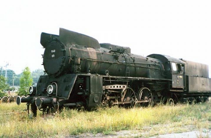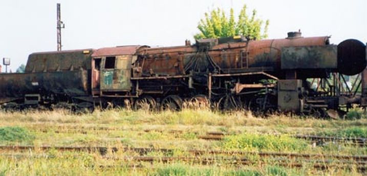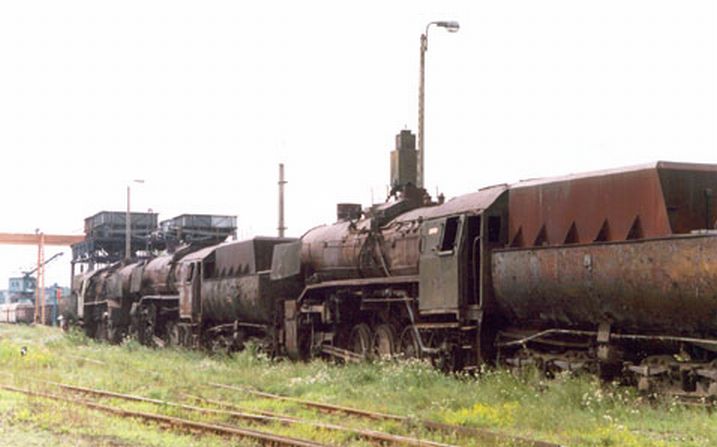 Wraki parowozów, w tle estakada węglowa, podczas naszego pobytu w sierpniu już nieistniejąca – zdjęcie z lipca 2002.