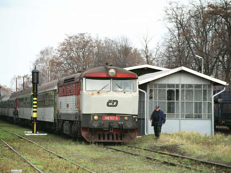 Cierpliwość nasza jak eter ulatnia się, a tu bach, wjeżdża druga czeska spalinówka 749107-9, która to przyjechała po owe wagony do samochodów przewozu naznaczone, nasza stoneczka je lekko wyciąga ze stacji, czech się podczepia i pod semafor.