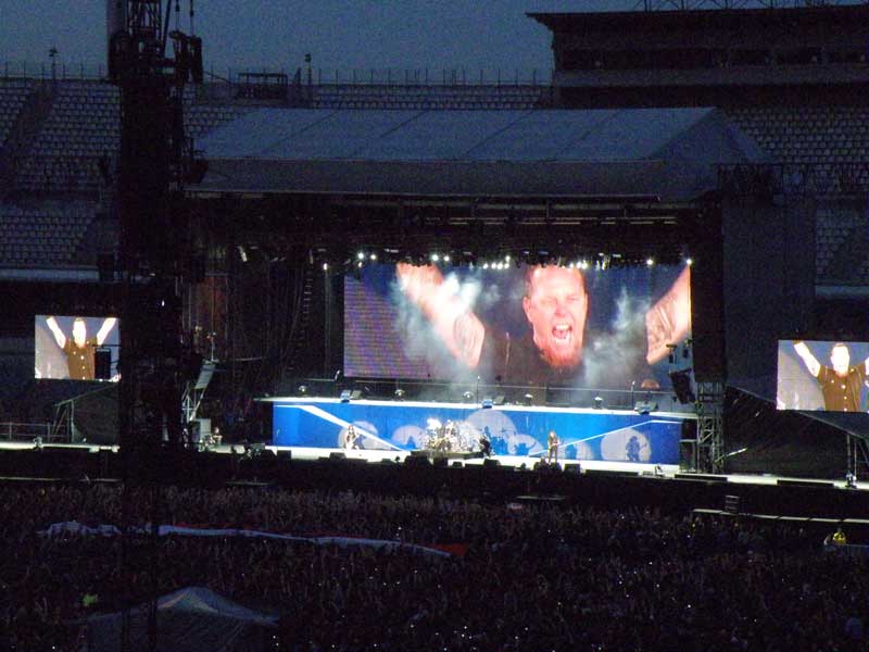 Tak więc naładowani uniesieniami kolejowymi w końcu dotarliśmy do celu ( nie bez perypetii, ale to temat na inną bajkę ;) ) - czyli miasta Chorzów. Pojazd nasz, potocznie nazywany „torbaczem” pozostawiliśmy pod czujnym okiem lokalnych stróżów prawa i udaliśmy się pieszo na słynny stadion śląski. Nie mogło zabraknąć klimatów szynowych i w czasie tej części podróży i tu mieliśmy do czynienia ze sto dwójkami , sto piątkami, oraz całą gamą innych nie znanych mi bliżej typów tramwajów. Aparat w tym czasie był głęboko zakamuflowany, gdyż wnoszenie sprzętu foto wyższej klasy niż 1,3 mpix w komórce, jest zabronione na tego typu imprezy ( copyrajty jakieś czy cóś ), stąd brak fotek z tej części ekspedycji. Dalej było już coraz mniej kolejowo, ale nie mniej o ile nie więcej emocjonalnie. Klasyk klasyków po kilkuletniej przerwie wraca na światowe estrady i nie wiedzieć czemu trasę swą zaczyna od naszego kaczogrodu, choć artykułowane w czasie występu wielokrotnie wspomnienia i postawa całej sześćdziesięciotysięcznej publiki rozwiewa wszelkie wątpliwości. Hetfield kilkakrotnie wspomina koncert sprzed czterech lat jak i wcześniejsze i podgrzewa publikę której jak i nam więcej nie było potrzeba. Zresztą jak to opisać? Lepiej kilka fotek . Chóralne śpiewy i ponad dwie godziny skakania rekompensowały Irkowi brak okrycia wierzchniego innego niż t-shirt, albowiem temperatura po zachodzie słoneczka sięgała zaledwie kliku, jak się wydawało stopni.