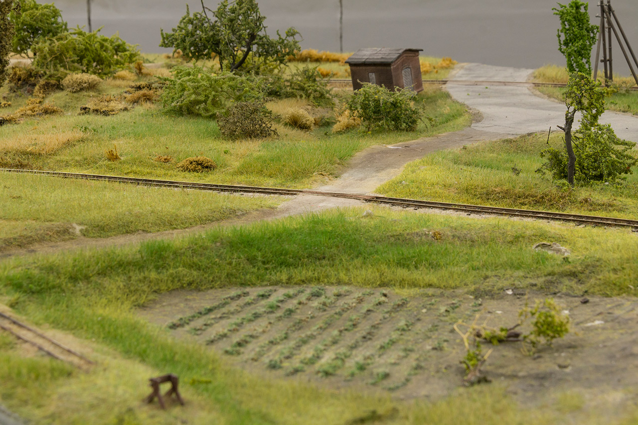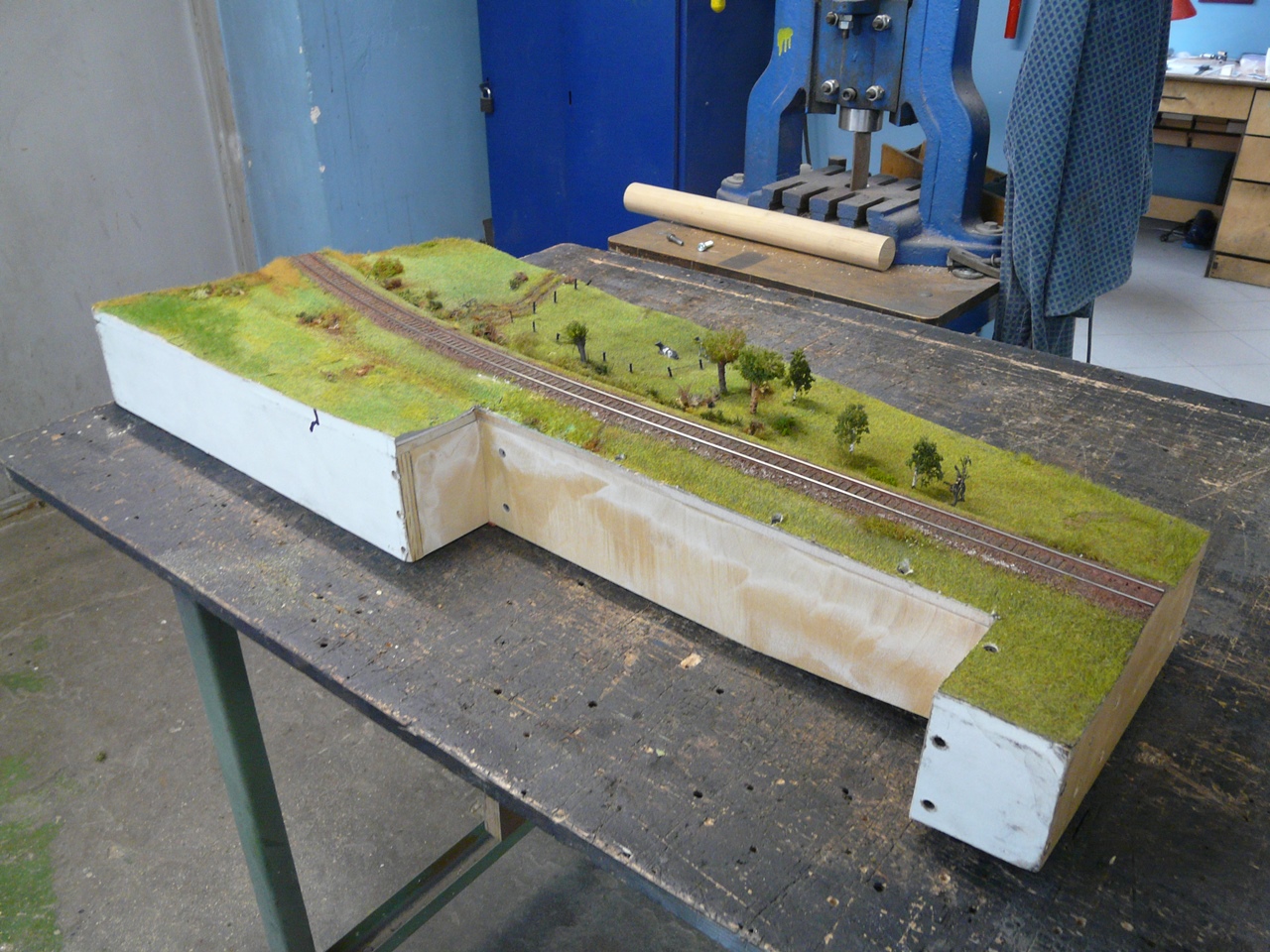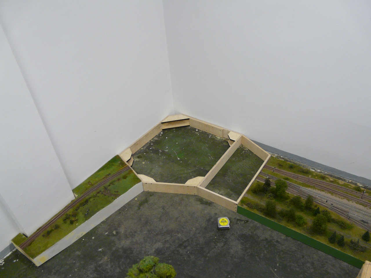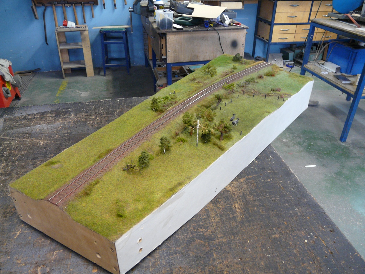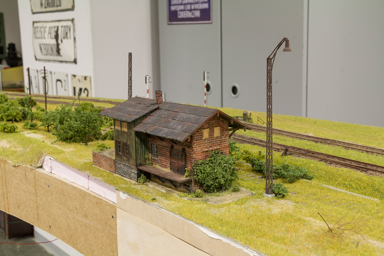 Na szczęście nie tylko gadamy ale też coś robimy. Makieta została rozkawałkowana i zaczęliśmy układankę "po nowemu". Piotrek R. szpachluje i maluje boki, Nemo zrobił już skrzynkę wjazdową na Szadek oraz wkomponował w "krowi" segment słup konstrukcyjny. Radek bawi się w Stwórcę i zazielenia Podg. Kaczorowo oraz odtwarza zieleń na segmentach wąskotorowych, ja robię dobre wrażenie i remizę OSP na Kaczorowie. Kilka obrazków z pola walki: