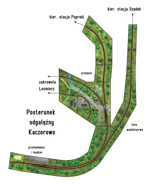 Wsiadając do pociągu odjeżdżającego ze stacji Paproki w kierunku wsi Kaczorowo, dworzec zostaje za nami w tyle, widzimy go w prawym oknie. Mijamy niewielką rampę, wagę wagonową, po lewej stronie pakamerę zbudowaną metodą gospodarczą ze starego pudła wagonu, trasa wchodzi w łuk, przejeżdżamy pod kamiennym wiaduktem, pociąg wjeżdża na nasyp. Zaraz za nasypem znajduje się posterunek odgałęźny Kaczorowo, gdzie do naszej linii kolejowej dołącza bocznica prowadząca do pobliskiej cukrowni Leśmierz a dalej, za zakrętem odgałęzienie leżącej na zachód od Paproków magistrali węglowej. Kaczorowo to niewielka osada, droga do niej prowadząca przecina linię kolejową w miejscu odgałęzienia bocznicy. Dalej przy krętej drodze widać przystanek PKS z drewnianą wiatą. Bocznica zabezpieczona jest żeberkiem ochronnym. Widać pozostałości dawnej sygnalizacji kształtowej, zastąpionej obecnie przez świetlną. Maleńka nastawnia będąca jednocześnie strażnicą przejazdową dopełnia urządzeń na przejeździe. Nieco dalej, za zakrętem, w miejscu gdzie do głównej linii kolejowej dołącza odgałęzienie węglówki, znajduje się dawna przeładownia wojskowa wraz z wąskotorówką prowadzącą do bunkra –pozostałości po mrocznej historii. Jadąc z Paproków przeładownię i bunkier mamy po prawej stronie. Jadąc w kierunku przeciwnym, jeśli pociąg kieruje się na odgałęzienie w kierunku magistrali węglowej wjeżdżamy w zakręt, mijamy wiadukt nad linią wąskotorową i możemy podziwiać sielski krajobraz wiejski. Pola, pasące się krowy, wiejskie drogi...