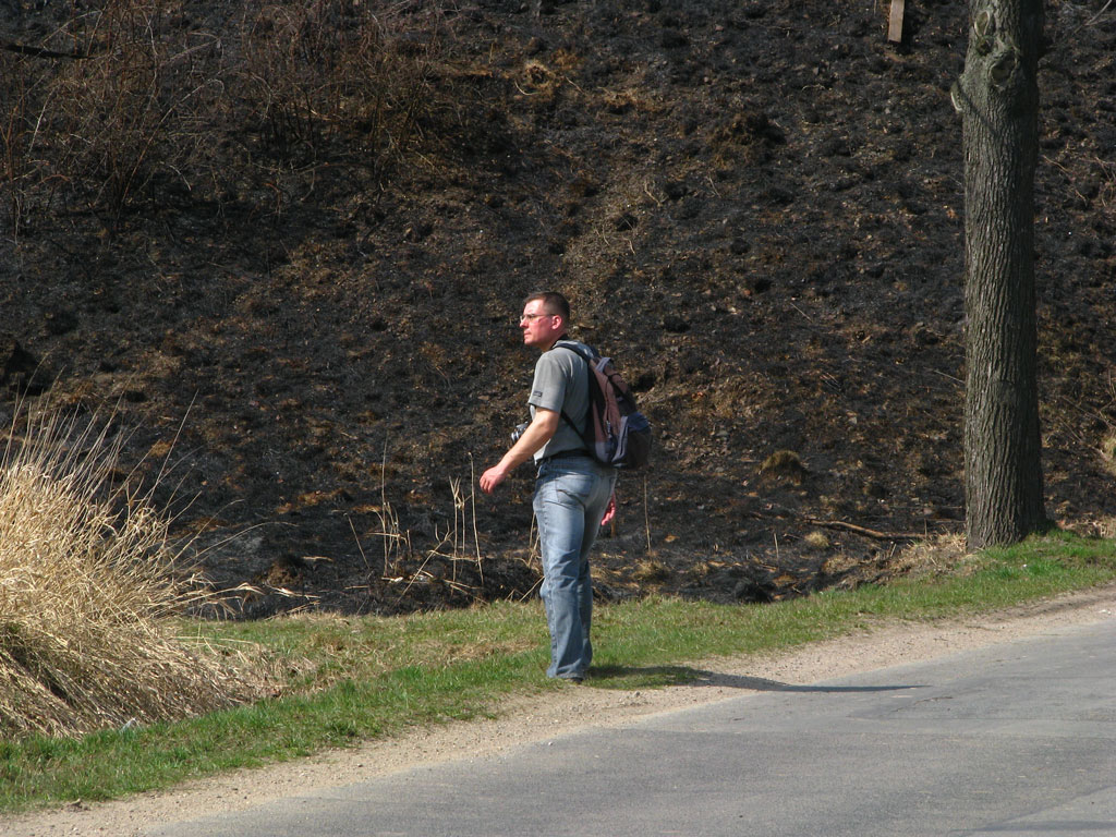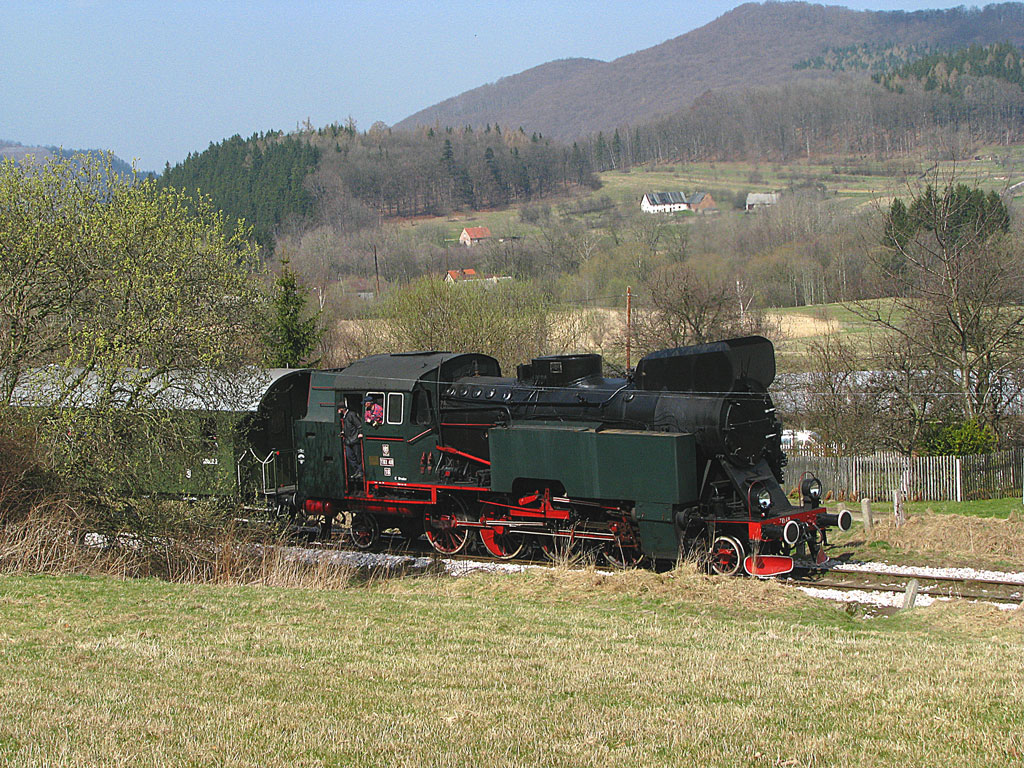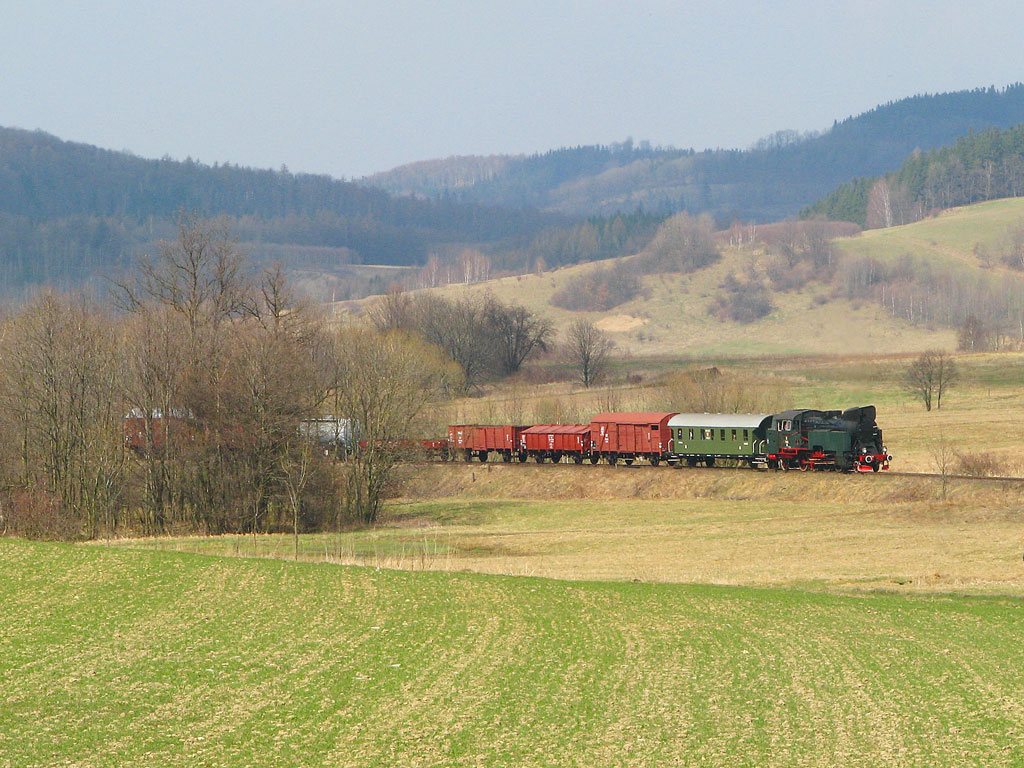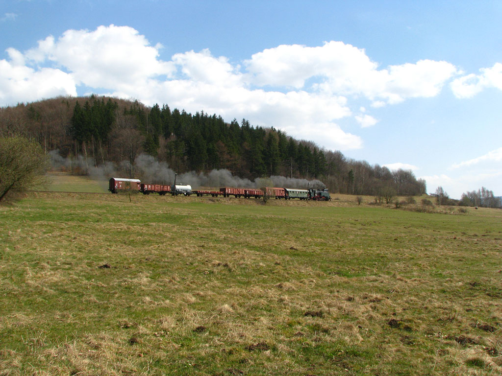 Kilka fotek w stacji i udajemy się na pobliską łączkę na pierwszy z planowanych fotostopów. Słoneczko pięknie przygrzało i rozkoszujemy się urokami wczesnej wiosny. Niestety tu wyszła spora wtopa organizatorów. Po pierwsze brak dyscypliny nad uczestnikami przejazdu, rozłazili się jak stonka po kartoflisku co opóźniało każdy fotostop. Po drugie słabo zorganizowany obrząd parowozu. Najpierw manewry na stacji potem wodowanie, oczywiście w połowie brakło wody i zanim strażacy z OSP dowieźli resztę parowóz stał bezczynnie. Wreszcie po niemal półtoragodzinnym oczekiwaniu maszyna ruszyła a my wraz z nią.