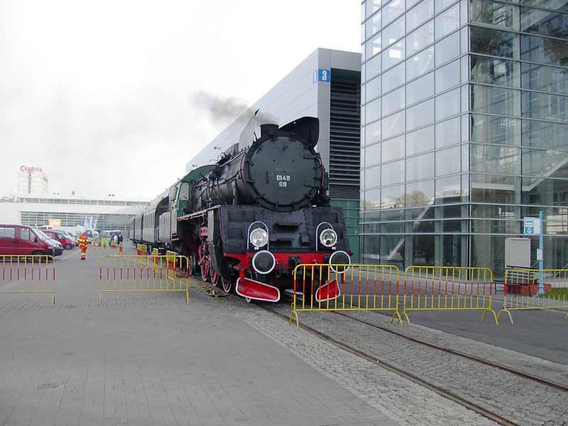 Po godzinie piętnastej zaczyna się robić luźniej, możemy sobie pozwolić na wypad do baru, na pyszne naleśniki z jabłkami, oraz na zrobienie fotek parowozu Ol49-69, który z odpustowymi tablicami z boku ostoi i okrągluśką tarczą na dymnicy, przyjechał, aby uświetnić Salon Hobby, i choć mało poważny, zawszeć to parowóz.