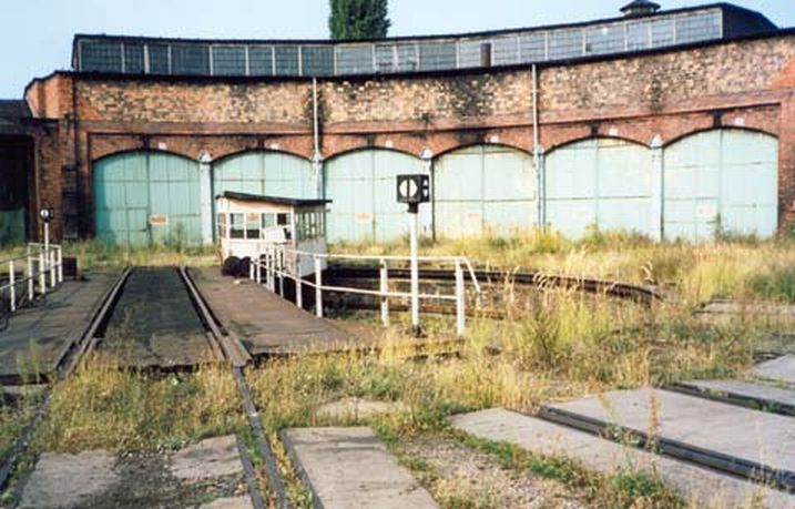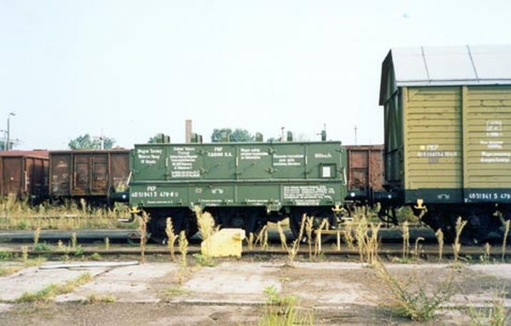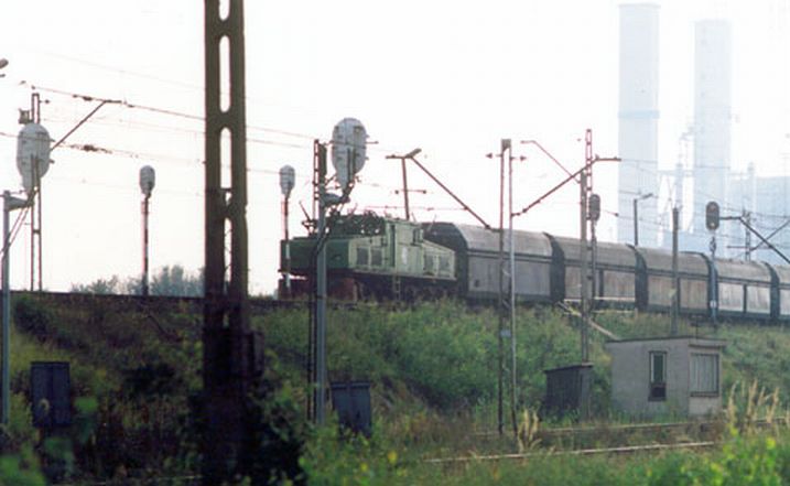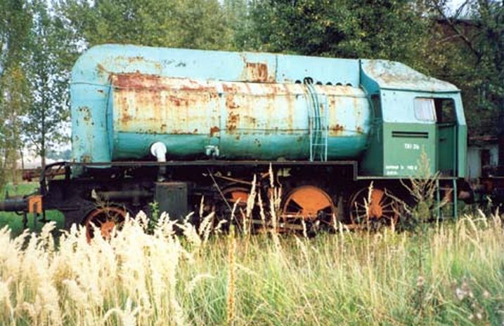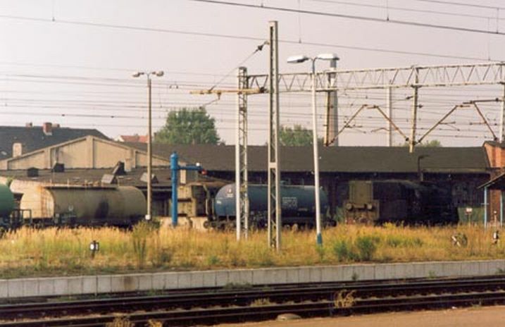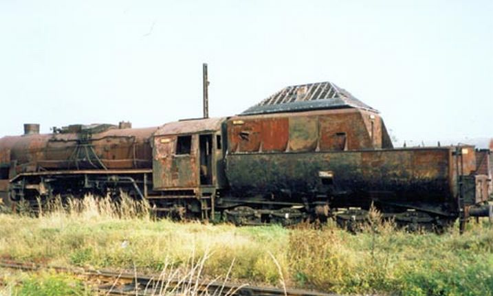 Wraki parowozów, w tle estakada węglowa, podczas naszego pobytu w sierpniu już nieistniejąca – zdjęcie z lipca 2002.
