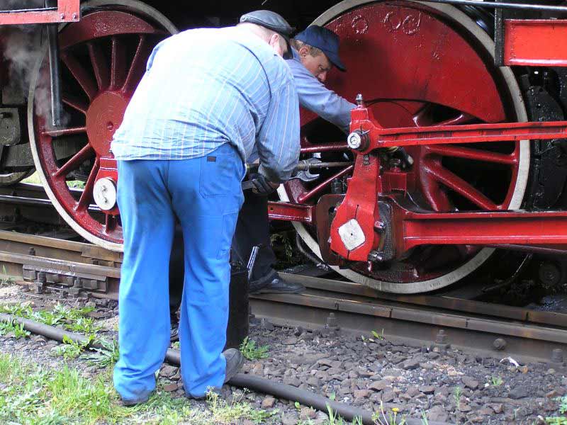 Angielski parowóz jak cacuszko, tylko trochę mało europejski, ginął wśród swych większych braci, myślę, że świetnie by się prezentował w towarzystwie "malucha" z Chabówki i "Śląska" z Pyskowic, choć niekoniecznie ze względu na inne przeznaczenie. Brawa dla naszych mechaników za białe koszule i rękawiczki, od razu przed oczyma stanął mi mechanik Orzechowski, tak trzymać. Współczuję małym dzieciom, których rodzice zmusili do wdychania dymu produkowanego ku uciesze nas "oszołomów" w nadmiarze, w imię wątpliwej dla zdecydowanej większości młodocianej widowni, atrakcji, ciekawe iluż z nich zniechęci to skutecznie do parowozów.