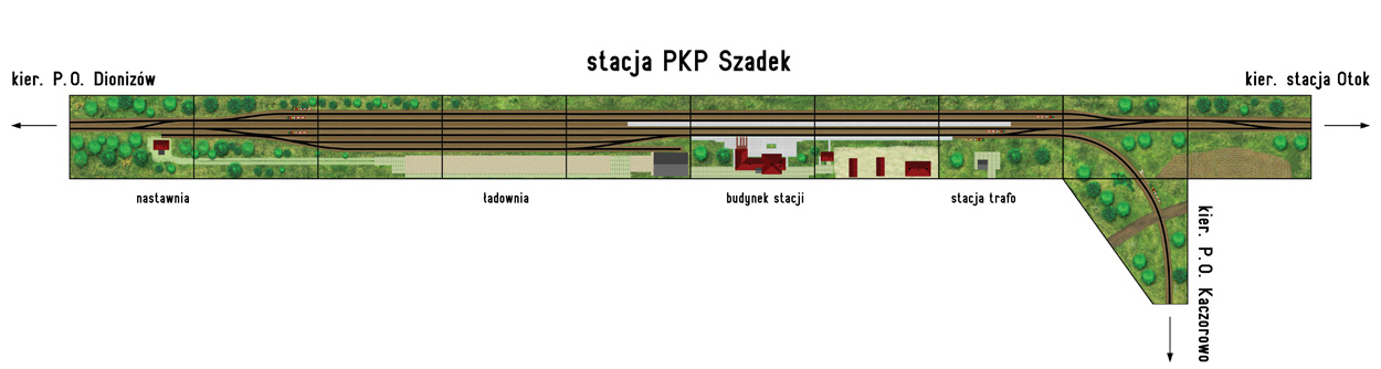 Szadek, stacja położona na magistrali węglowej –największej inwestycji przedwojennej Polski. Jedna z wielu podobnych rozłożonych w miarę regularnie wzdłuż całej długości linii. Pamięta zarówno Trumany (Ty246), potężne amerykańskie parowozy, jak i dwuczłonowe elektrowozy kursujące w czasach największych przewozów węgla. Trzy krawędzie peronowe, ładownia, typowe dla węglówki zabudowania stacyjne. Ducha starej kolei przypominają mechaniczne okręgi nastawcze i rząd naprężaczy. Świetlna sygnalizacja wyraźnie wskazuje, że idzie nowe. Odgałęzienie odchodzące z peronu 1 umożliwia dojazd do P.O. Kaczorowo i dalej do małej stacyjki Paproki, a pośrednio do cukrowni Leśmierz.